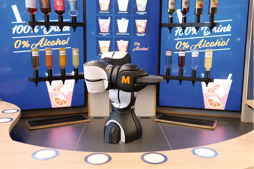 Die Lösung liegt hier im Design oder in der Technik. Man kann den freien Arm an bestimmten Stellen vom Benutzer abschirmen, ohne dass man ein vollständiges Gehäuse aus Glas und Metall nutzt. Oder man verbessert den Cobot, der ohnehin schon gut mit Nähe von Menschen umgehen kann, noch weiter für die spezifische Situation. So könnte man die Geschwindigkeit bei der Zubereitung der Getränke reduzieren, was freilich dem Showeffekt zuwiderläuft.