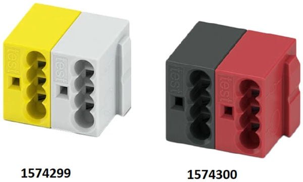 Die Steckverbinder sind farblich unterschiedlich, um die KNX-Kodierungsanforderungen zu erfüllen, und ermöglichen so eine genaue Verdrahtung. Die Steckverbinder 1574299 sind grau/gelb, während die 1574300 rot/schwarz sind. Beide bieten jeweils zwei Kontakte, die in einer einzigen Reihe angeordnet sind, mit vier Drahtanschlüssen pro Kontakt. Die vier Anschlüsse bieten eine einfache Methode zum kontinuierlichen Durchschleifen von Potenzialen in Busanwendungen. Beachten Sie, dass jeder Kontakt über einen Prüfanschluss verfügt, der einen einfachen Zugang für eine Sonde ermöglicht.