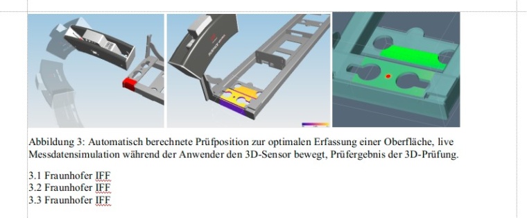 Mit dem Streifenlichtsensor können Daten für geometrische Messungen erfasst werden. Dazu arretiert der Prüfer den Sensor mit einem Mensch-Roboter-Kollaboration-fähigen Roboter an einer beliebigen Position und löst eine Messdatenaufnahme und -auswertung aus. Über eine modellbasierte Planung von Prüfansichten, verbunden mit einer Roboterbahnplanung, werden automatisiert die Voraussetzungen geschaffen, dass relevante Bauteilbereiche aus Ansichten gemessen werden können. Dabei werden die Abstände der Messdaten zum CAD-Modell gemessen und in einer typischen Falschfarbendarstellung visualisiert. Abweichungen in der Geometrie lassen sich somit messen und Bauteile, die außerhalb der Toleranz liegen, vor der Bearbeitung aussortieren, bzw. die NC-Bearbeitungsprogramme anpassen. Um dem Prüfer auch eine einfache Bedienung dieses Sensors ohne Trial-And-Error zu ermöglichen, wird live eine Messdatensimulation visualisiert. Dabei wird in Echtzeit berechnet, welche Messdaten der Sensor am idealen Bauteil aufnehmen würde. Zusätzlich zum Ort wird auch die zu erwartende Qualität der Messdaten in Bezug auf die Ausrichtung zur Bauteiloberfläche und mögliche Totalreflexionen dargestellt. Somit wird der Prüfer in die Lage versetzt, den Sensor recht intuitiv in vorgegebene Aufnahmepositionen zu bewegen, die ein Prüfplaner in der Arbeitsvorbereitung zuvor festgelegt hat (s. Abbildung 3).