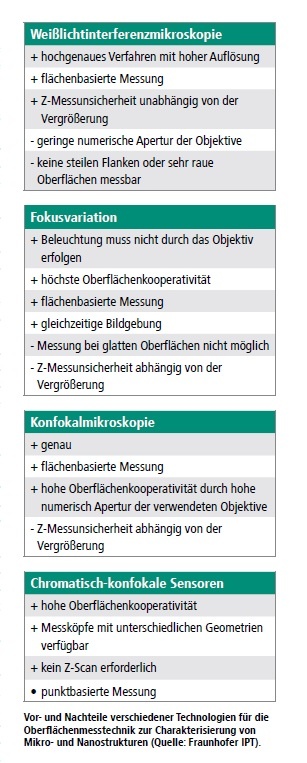 Von den vorgestellten Verfahren ist die Weißlichtinterferometrie das genaueste, die konfokalen und chromatisch-konfokalen Verfahren liegen in der Mitte und die Fokus-Variation reiht sich am oberen Ende des Spektrums ein.
