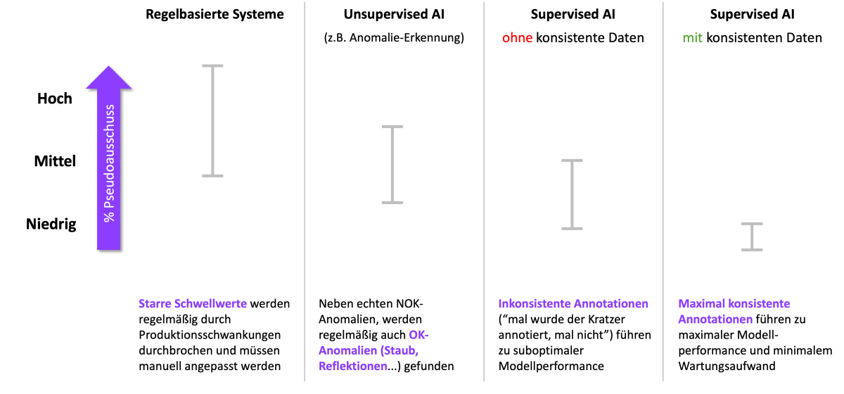 Wesentlich besser agieren dagegen Modelle mit überwachten KI-Algorithmen, also Supervised AI. Diese Modelle sind grundsätzlich in der Lage, das Problem von zu hohem Pseudoausschuss zu lösen.