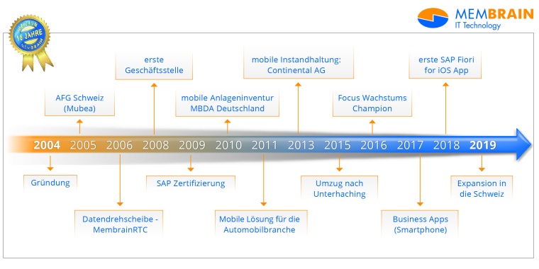 Mit der AFG (der heutigen Mubea Präzisionsstahlrohr AG) konnte Membrain bereits 2005 den ersten Großkunden gewinnen und somit die Technologie im Markt platzieren. Bei Mubea werden die Lösungen von Membrain innerhalb der Produktions- und Logistik- Kette eingesetzt. Aufgrund der wachsenden Nachfrage im Bereich mobile Datenerfassung, wurde in den darauffolgenden Jahren die Plattform nachhaltig weiterentwickelt, die bis heute unter dem Namen Membrainrtc – Plattform für Industrie 4.0 – bekannt ist. 2008 erfolgte dann die Eröffnung der ersten Geschäftsstelle im südhessischen Bensheim. Da von Anfang an der Fokus auf SAP-Kunden lag, folgte 2009 die SAP-Zertifizierung und -Partnerschaft. Mit der Erweiterung der Anwendungen auf spezifische Geschäftsbereiche wurde ab 2010 PAS-AM als Lösung für die mobile Anlageninventur eingeführt, die von dem Kunden MBDA Deutschland seitdem erfolgreich eingesetzt wird. Eine weitere innovative Branchenlösung (PAS-PM) mobilisiert seit 2013 die Instandhaltung. Die Firma Continental AG, die sehr früh auf Digitalisierungsthemen setzte, entschied sich für diese Lösung noch im selben Jahr und setzt seitdem Membrainpas-PM zur mobilen Datenerfassung für die Planung, Steuerung, Dokumentation, Analyse und Organisation der Instandhaltung ein.