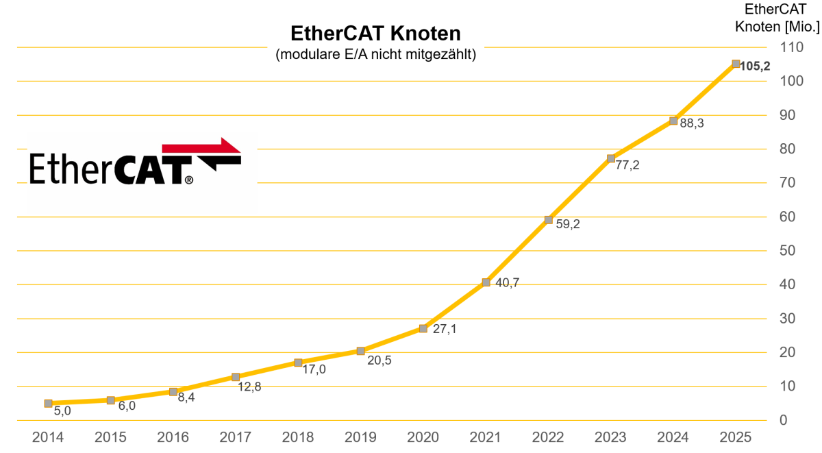 Ethercat hat mit 105,2 Millionen installierten Knoten seine führende Rolle unter industriellen Echtzeit-Ethernet-Systemen weiter ausgebaut