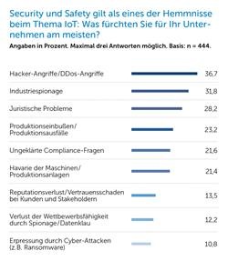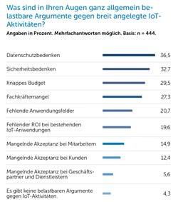 Datenschutzbedenken nennen 37 Prozent der befragten Unternehmen an erster Stelle als Argument gegen einen umfassenden IoT-Einsatz. Das gilt vor allem für die kleinen Firmen mit weniger als 500 Mitarbeitern und große Firmen mit mehr als 1.000 Mitarbeitern. Ein Drittel der Unternehmen nennt Sicherheitsbedenken als größtes Hindernis. Sie fürchten vor allem Hacker-Angriffe/DDoS-Angriffe, Industriespionage oder juristische Probleme. Ein knappes Budget (30 Prozent), Fachkräftemangel (27 Prozent) und fehlende Anwendungsfelder (21 Prozent) sind weitere Gründe. Ein Fünftel der Firmen würde aufgrund schlechter Erfahrungen und eines fehlenden Return on Investments (ROI) bei bestehenden IoT-Anwendungen auf eine breite IoT-Initiative verzichten. Auch mangelnde Akzeptanz bei Mitarbeitern, Kunden, Geschäftspartnern und Dienstleistern spielen eine Rolle.