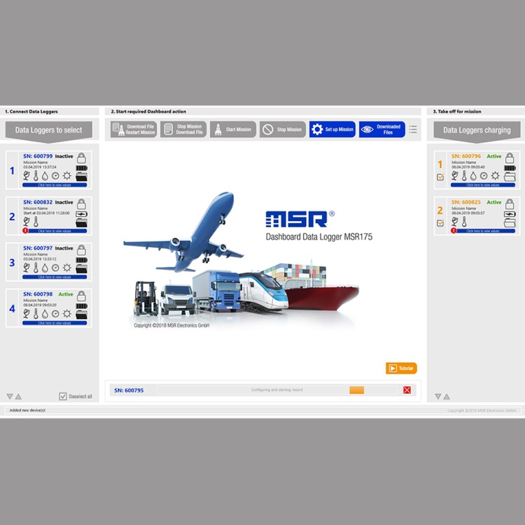 Via USB-Schnittstelle lassen sich die von dem Datenlogger erfassten Messdaten schnell auf einen Rech¬ner übertragen. Um – beispielsweise zu Dokumentationszwecken – rasch einen kompakten Bericht der Messdaten abzurufen, genügt ein Klick auf den "MSR ReportGenerator". Für eine detailliertere Messdatenauswertung relevanter Schock-Ereignisse steht dem Anwender die "MSR ShockViewer"- Auswertesoftware zur Verfügung. Und zum Starten eines Aufzeichnungs-Zyklus dient ein Software-„Dashboard“, das die Konfigurierung des Loggers per PC mit wenigen Maus-Klicks gestattet.