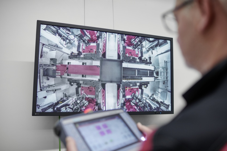 Dabei kommunizieren die Maschinen und Handlingsysteme untereinander und mit übergeordneten Leitsystemen über moderne Industrie-4.0- taugliche Kommunikationsnetzwerke. 20 fahrerlose Transportsysteme übernehmen automatisiert die Transporte im Werk. Verpackung, Kennzeichnung und der Weitertransport zur Distribution erfolgen ebenso automatisiert. Mithilfe wissensbasierter Systeme, die kontinuierlich „dazulernen“, werden Ausfallzeiten verringert, Wartungen vorausschauend geplant und damit Störungen des ausgeklügelten Produktionsprozesses minimiert.