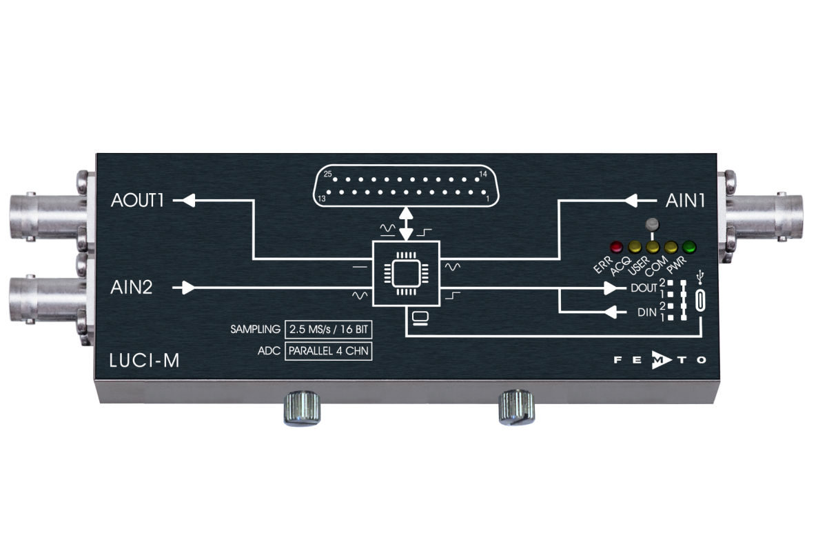 Features: 16-bit ADCs digitize measured values with a bandwidth of up to 1.1 MHz. Depending on the model, two or four synchronously acquiring ADCs are available for multi-channel signal measurement with precise time correlation. Three 12-bit DACs control external devices or serve as a bias voltage source. 24 digital I/Os read status and alarm signals and switch external peripherals. LUCI-M can be permanently connected to FEMTO devices with a D-Sub-25 connector, such as the DLPCA-200. Thus, LUCI-M and the amplifier/photodetector combine to form a compact device. Thanks to its SCPI-compatible command set and USB interface, LUCI-M is not tied to any specific computer hardware, software, or programming language. It is platform-independent. Downloadable Python scripts demonstrating communication with LUCI-M make it easy to get started with programming. The examples include remote control of FEMTO products and use as a data acquisition system.
